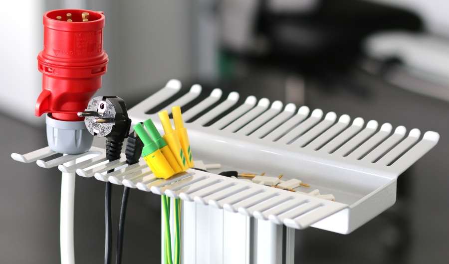 Modular aufgebauter Messleitungswagen für 4mm- Labormessleitungen und Schuko-Zuleitungen bestehend aus: